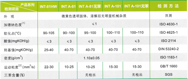 醛樹脂是一種無色或者微黃色的醛縮聚樹脂,不溶于水,能溶于絕大多數(shù)有機溶劑,與涂料/油墨配方中的原材料有良好的相容性,具有抗黃變性能。主要用作通用色漿的研磨樹脂及應(yīng)用于涂料/油墨配方中,具有良好的展色性,能夠有效提高涂料的附著力、硬度、光澤度、固體含量及涂膜的豐滿度。是一種多功能涂料/油墨助劑。根據(jù)其不同的性能和應(yīng)用范圍,醛樹脂有INT A-81、INT A-81無苯、INT A-101和INT A-101無苯系列產(chǎn)品。